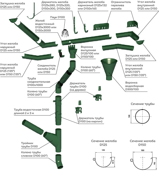 Водосточную систему Foramina® круглого сечения изготавливают с желобами 125 или 150 мм. Вы можете выбрать любой диаметр в зависимости от площади и конфигурации крыши. Если площадь ската не превышает 100 м2, рекомендуем выбрать жёлоб 125 мм. Для более крупных крыш оптимален желоб 150 мм.