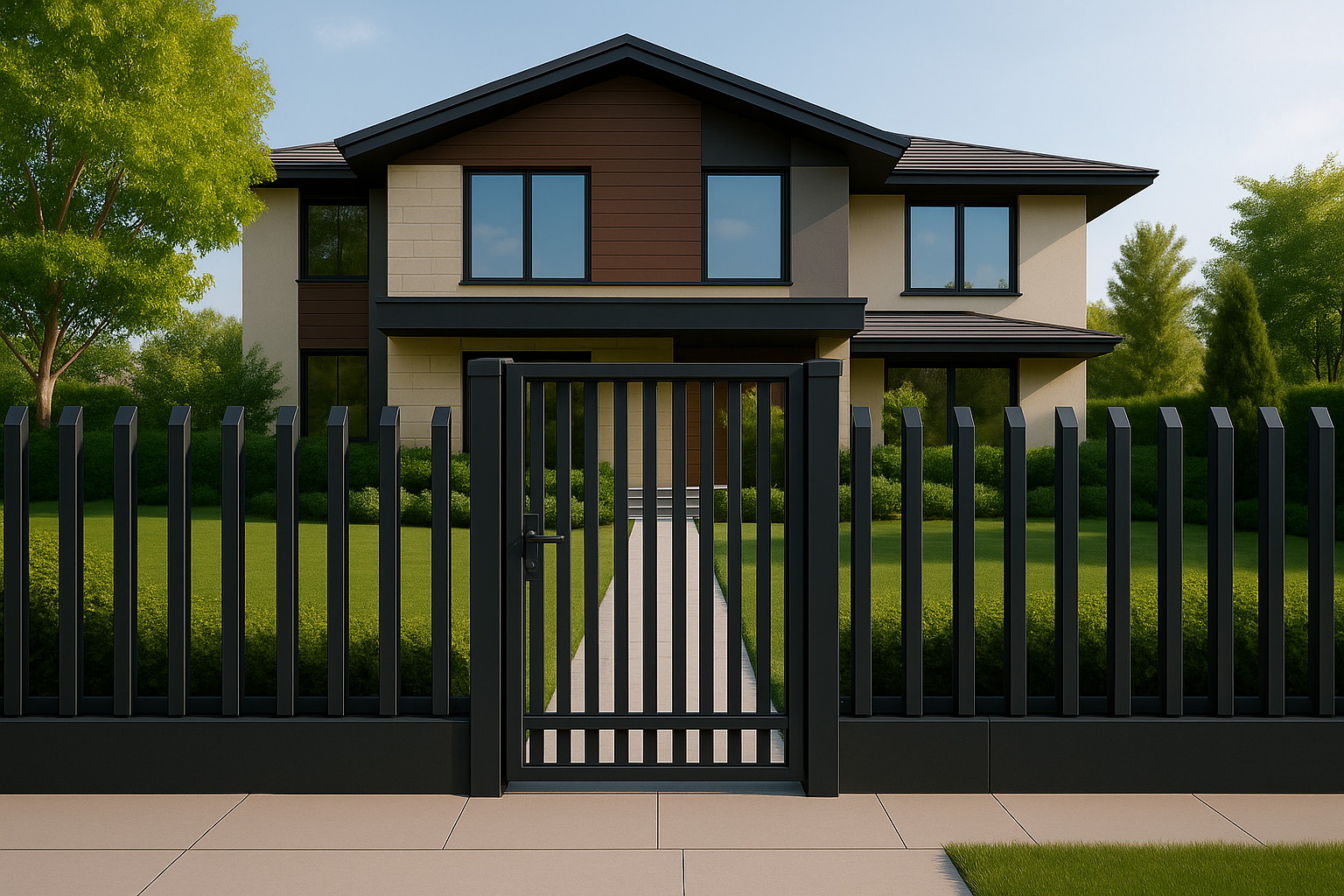 Забор из алюминия Расчёска имеет оригинальный внешний вид. Алюминиевые планки со скосом, которые расположены вертикально
